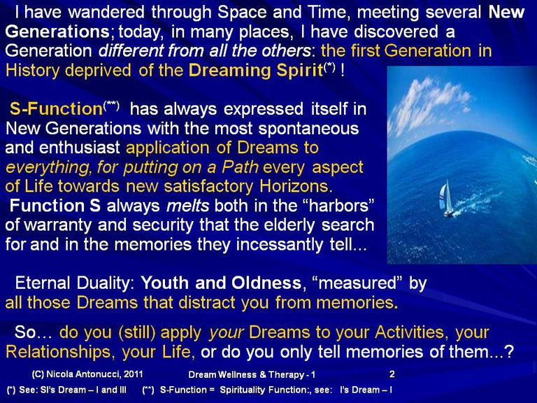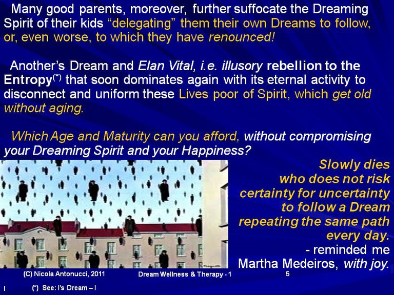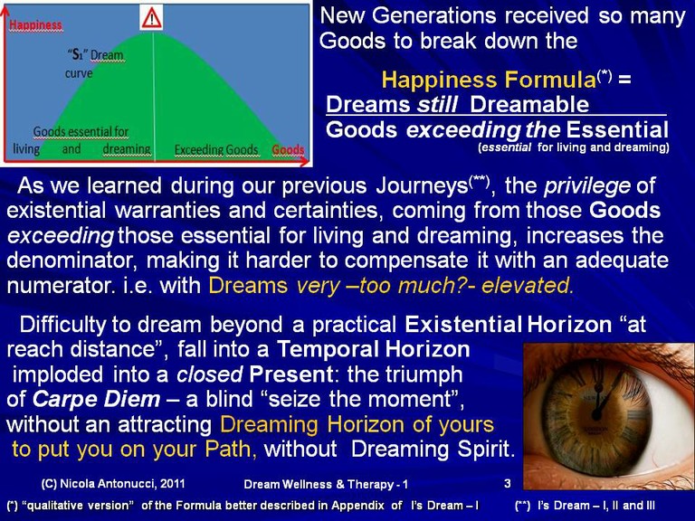 In this new journey through Dream Wellness & Therapy, we will discover how much Happiness for Young and Elderly people is determined by Dreams rather than (im)material Goods and how much real Youth is “measured” by the Ability to Dream (rather than the habit to tell memories, typical of a certain kind of Oldness...).