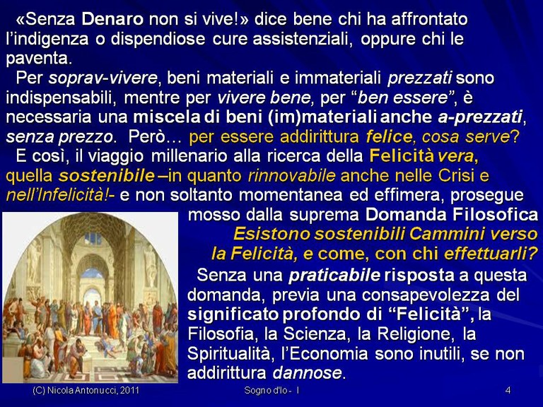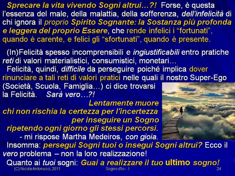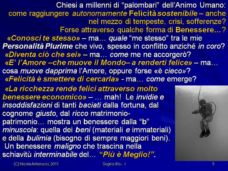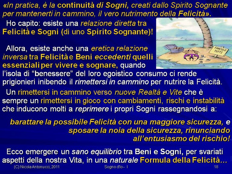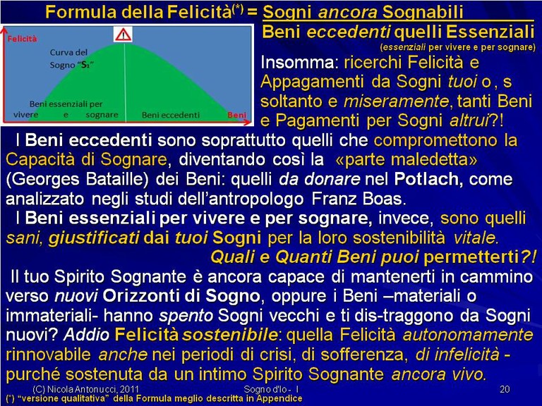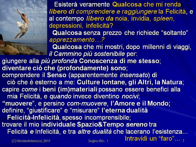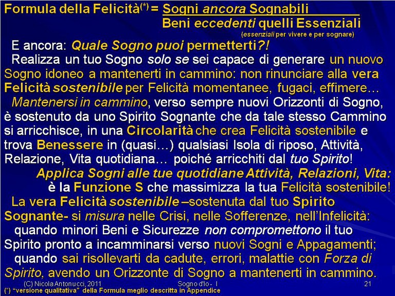 - Come diventare liberi di vivere una Felicità sostenibile senza comprometterla con Felicità momentanee, fugaci, effimere.. poiché la vera Felicità sostenibile è un “ottovolante” che ci risolleva dalle cadute, dagli errori, dalle malattie con la Forza di Spirito che ci mantiene in cammino verso nostri Orizzonti di Sogno!